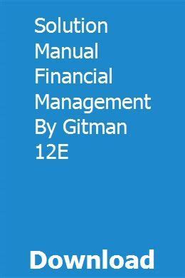 Download solution manual financial management by gitman Doc online is a convenient and frugal way to read solution manual financial management by gitman you love right from the comfort of your own home. Yes, there sites where you can get Doc "for free" but the ones listed below are clean from viruses and completely legal to use.